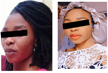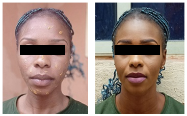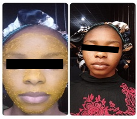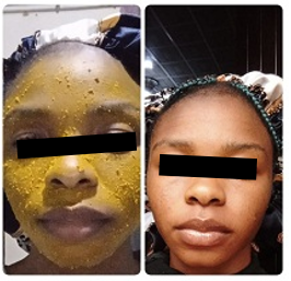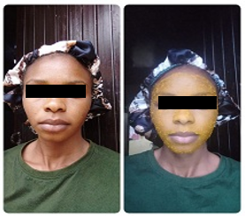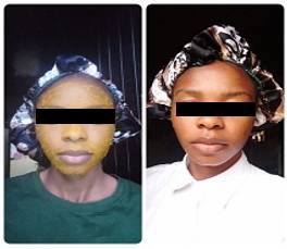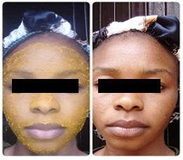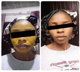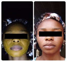 The mixture was applied on the face at 8 pm and allowed till 8 am (12 hrs) before washing. The face after washing was snapped.